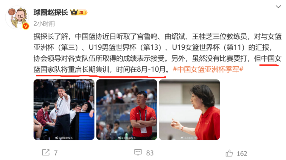 而在接下来暂时没有什么重要比赛任务的情况下,据媒体人球圈赵探长透露,中国篮协近期听取了宫鲁鸣、曲绍斌、王桂芝三位教练员对女篮亚洲杯(第3)、U19男篮世界杯(第13)、U19女篮世界杯(第11)的汇报,协会领导对各支队伍所取得的成绩表示接受。另外,虽然没有比赛要打,但中国女篮国家队将重启长期集训,时间在8月-10月。此消息一出,引来了不少球迷的唏嘘:“长期集训没用的”、“又开始闭门造车了”。